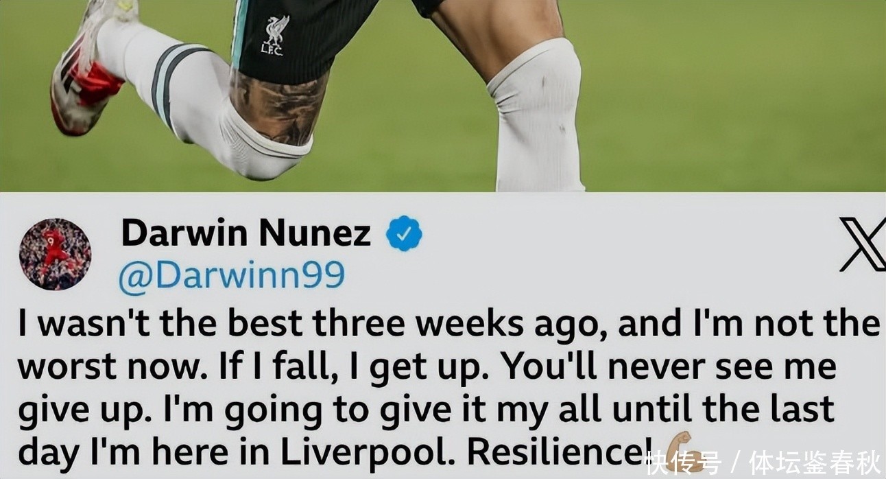 尽管如此,努涅斯在社交媒体上发表了一篇激励性的帖子,表示:“如果我跌倒,我会站起来。你永远不会看到我放弃。我会全力以赴,直到我在利物浦的最后一天。”