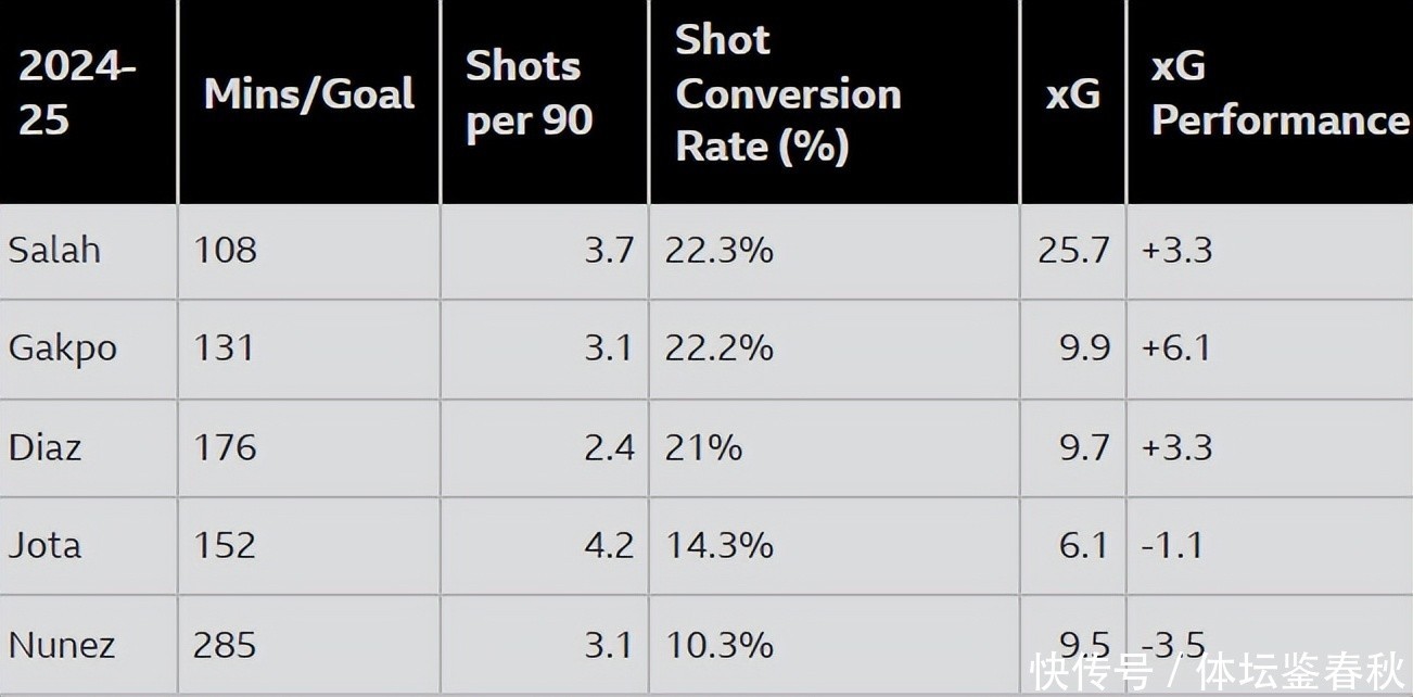 从数据来看,努涅斯本赛季在各项赛事中的射门转化率仅为10.3%,远低于他在锋线上的几个队友,穆罕默德·萨拉赫(22.3%)、科迪·哈克波(22.2%)和路易斯·迪亚兹(21%)。而在英超各队的前锋中,努涅斯的射门转化率仅排在第22位。